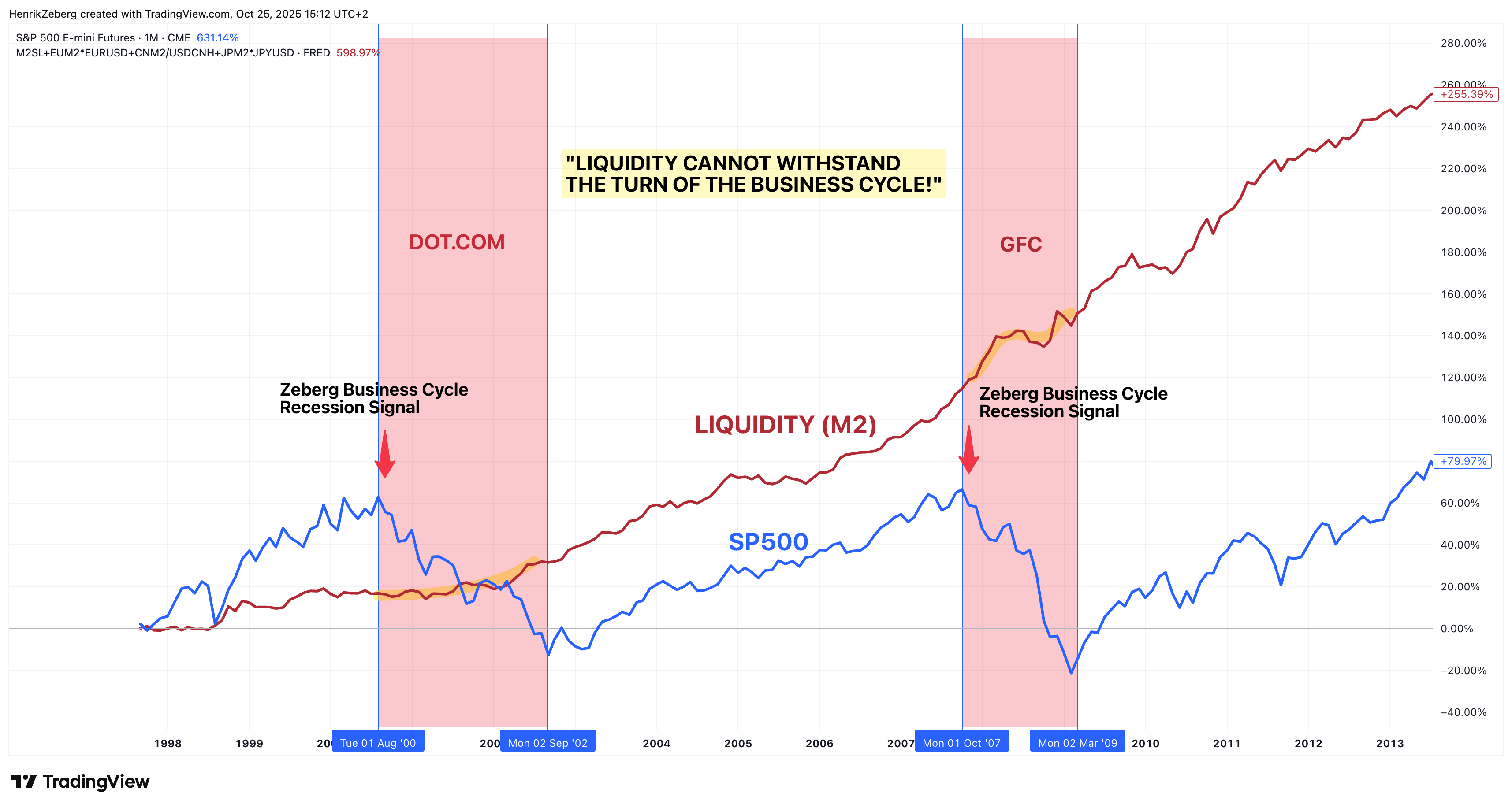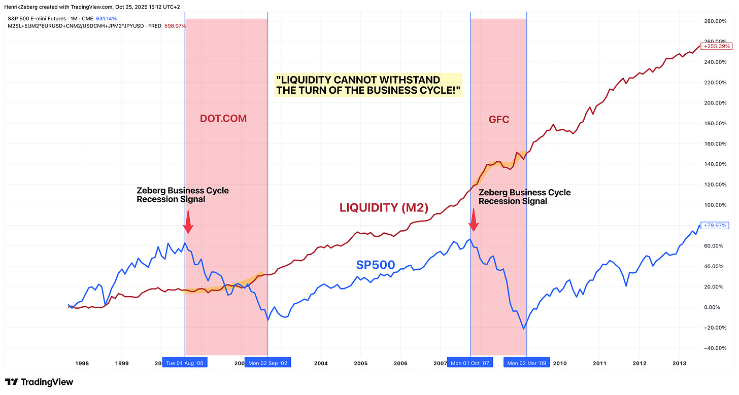 Even massive liquidity infusions can’t hold up a market in freefall. The chart above plots a composite global M2 money supply (red line, an aggregate of U.S., EU, China, and Japan M2) against the S&P 500 (blue line) during past cycles. Note how liquidity (red) was rising or near highs heading into the 2000 and 2008 recessions – central banks were easing aggressively – yet the S&P 500 still crashed ~50% in each episode[2][3]. The annotations highlight “Zeberg Business Cycle Recession Signal” just before each major market peak, and the big bold reminder: “LIQUIDITY CANNOT WITHSTAND THE TURN OF THE BUSINESS CYCLE!” Once the real economy rolled over, all that money sloshing around was pushing on a string. The market tanked regardless, proving that liquidity is no silver bullet when the cycle turns.**