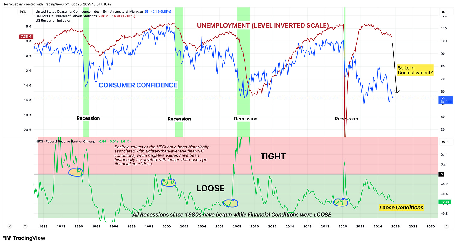 All U.S. recessions since the 1980s have begun while financial conditions were loose, not tight (see green shaded areas in the lower panel). In the chart above, negative values of the National Financial Conditions Index indicate looser-than-average conditions – and every gray recession bar started with the index well below zero. In other words, ample liquidity and easy credit did not prevent the onset of recessions. Notably, consumer confidence (blue line) tends to plunge before recessions, even as unemployment (red line, inverted scale) sits at cycle lows and only spikes during the downturn. Loose money and complacency go hand in hand until – seemingly out of nowhere – unemployment surges and a recession is recognized in hindsight.