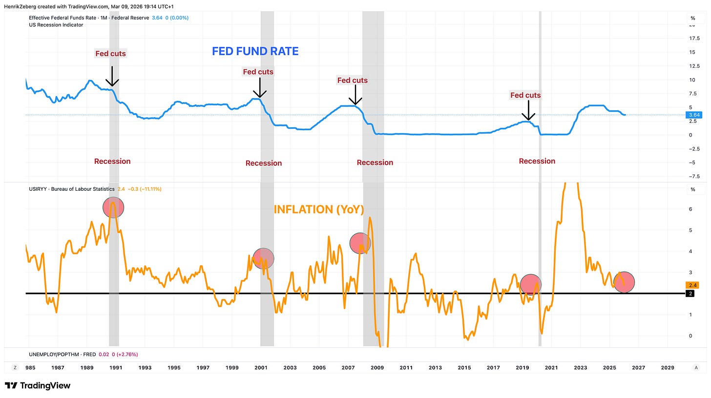 The chart illustrates a striking pattern across multiple decades of economic cycles. In several instances, the Federal Reserve began cutting interest rates while inflation was still elevated or even rising. At first glance, this appears counterintuitive. If the central bank’s mandate emphasizes price stability, why would it ease policy while inflation remains high?