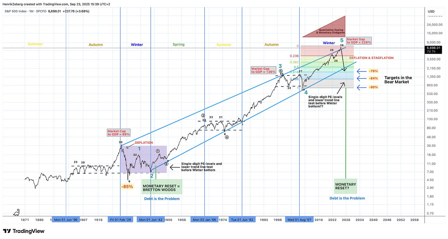 Over the past five years the U.S. stock market has staged one of the most dramatic rallies in its history. From the March 2020 pandemic low around 2,200, the S&P 500 has tripled to over 6,600, a +204 % gain in just half a decade. This surge is not a reflection of booming productivity or sustainable growth; it is the blow‑off top of a bubble that has been building for seventeen years. In my writings since 2022 I have argued that markets were entering a terminal phase in which liquidity and speculation would drive prices vertically before collapsing. Recently, hedge‑fund manager Mark Spitznagel echoed this view, comparing the set‑up to 1929. Spitznagel’s warning may have caught the headlines, but he has merely joined the choir — this blow‑off top has been visible for years in the cycles and charts we will examine.