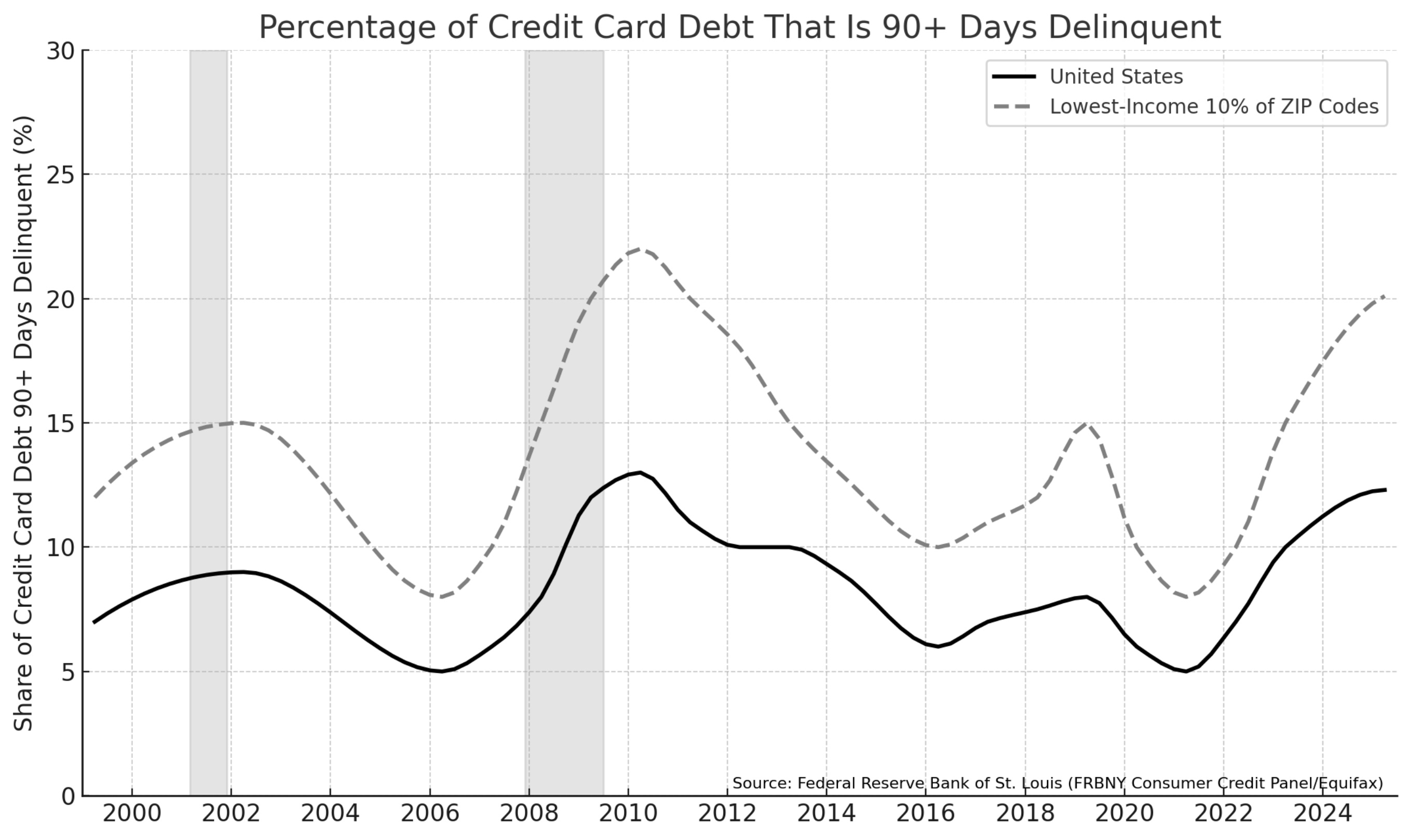 Figure 1: Rising Credit Stress Among Consumers. Percentage of credit card debt 90+ days delinquent in the United States (black line) versus in the poorest 10% of ZIP codes (dashed line). Delinquency rates spiked in the aftermath of the 2008 financial crisis, then fell during the 2010s expansion. Since 2021, however, they have been climbing again – reaching ~12% nationally and ~20% in low-income areas by early 2025. These levels are approaching those of the Great Recession, a troubling sign given the relatively strong labor market over this period. (Source: FRB NY Consumer Credit Panel/Equifax)