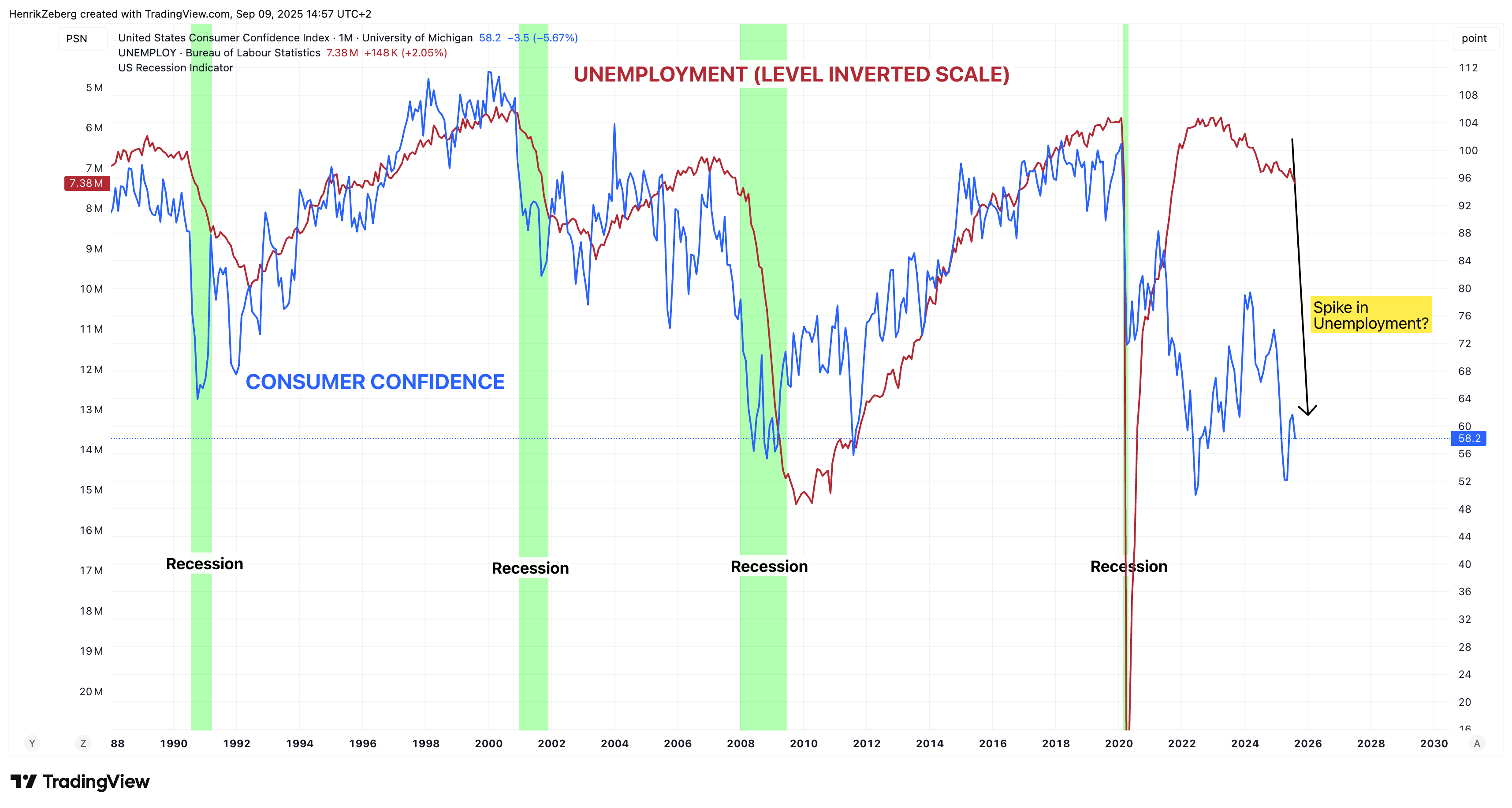 Figure: University of Michigan Consumer Confidence (blue line, left axis) versus the number of unemployed persons (red line, right axis, inverted) in the U.S., with recessions shaded in gray. Consumer confidence is near multi-decade lows (around 58), while unemployment (currently very low) is poised to spike upward, as indicated by the divergence and the question mark annotation.